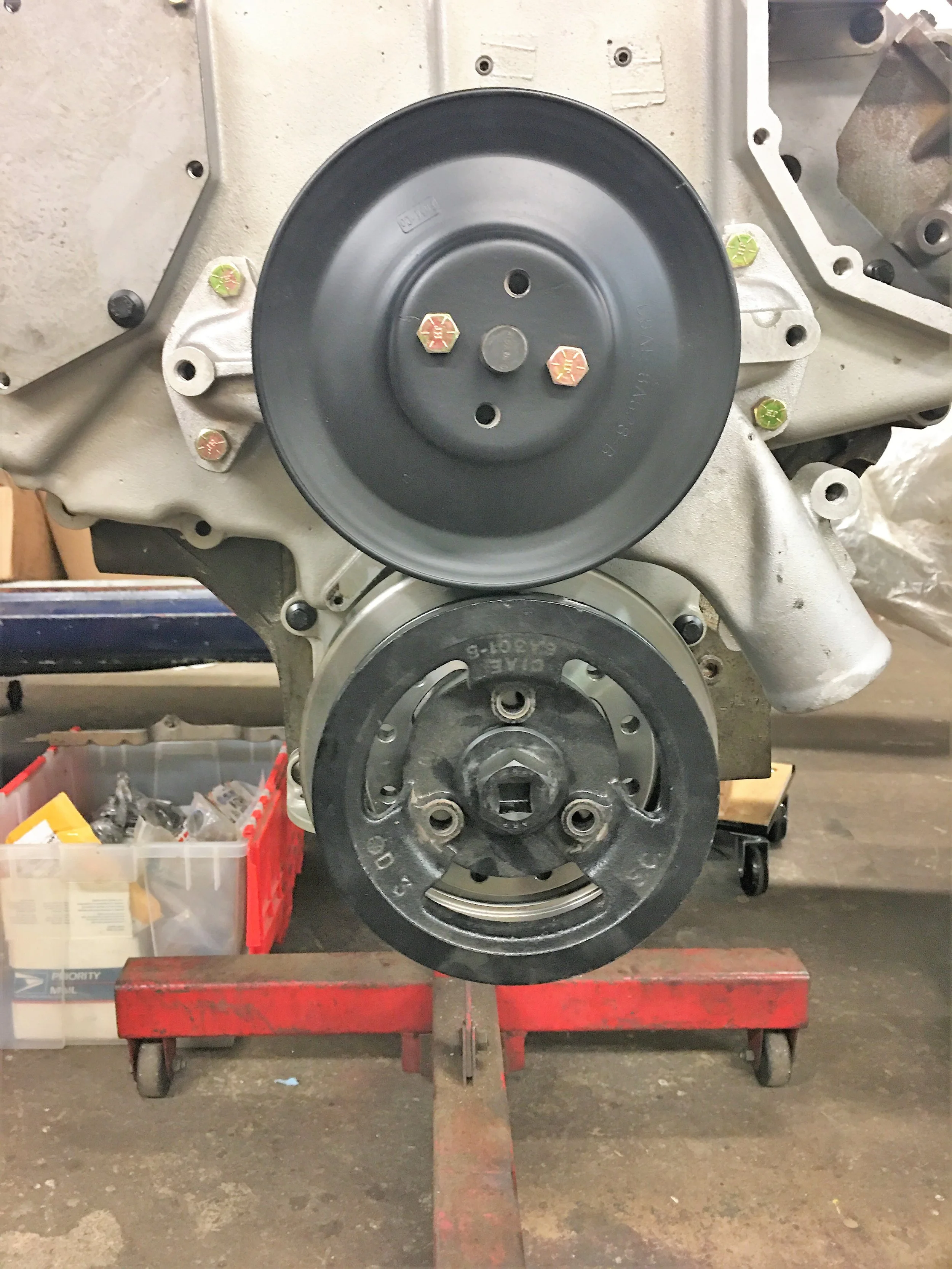 The crank and spacer combo were removed from the “SOHC parts” bin and bolted to the mocked up engine. I’m not thinking of future 2 V pulleys, I’m only thinking of finding a pulley for the water pump and right now, what I have is a single V crank pulley and that’s what will be reference for the entire system.